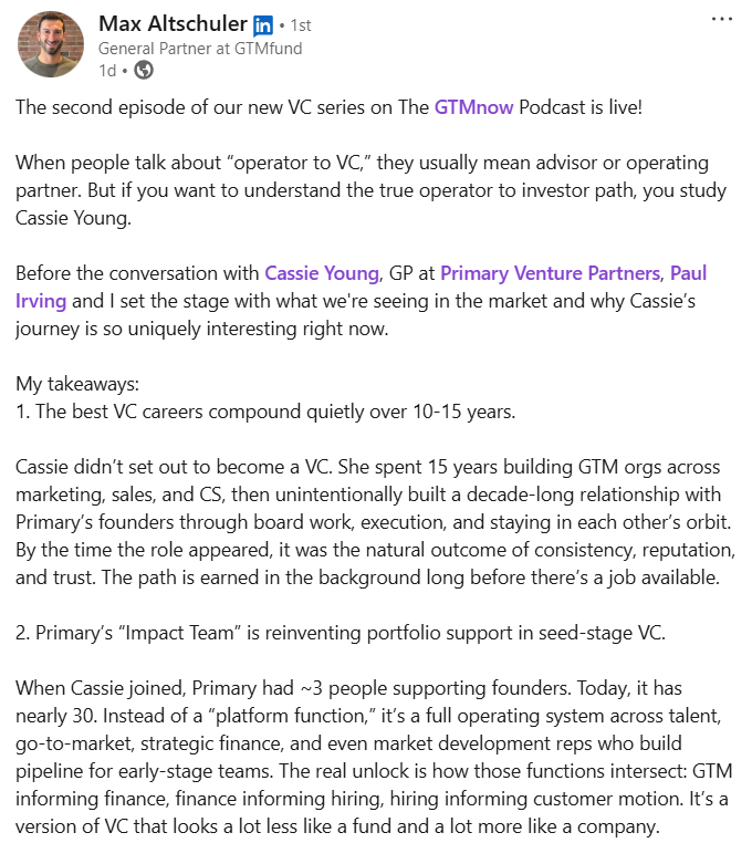 Cassie didn’t “switch” into VC so much as compound 15 years of GTM execution, board exposure, and trusted relationships with investors like Primary’s co-founders. Her story is a reminder that the best venture jobs usually come after a long track record of doing hard things in the trenches, not from a cold application.