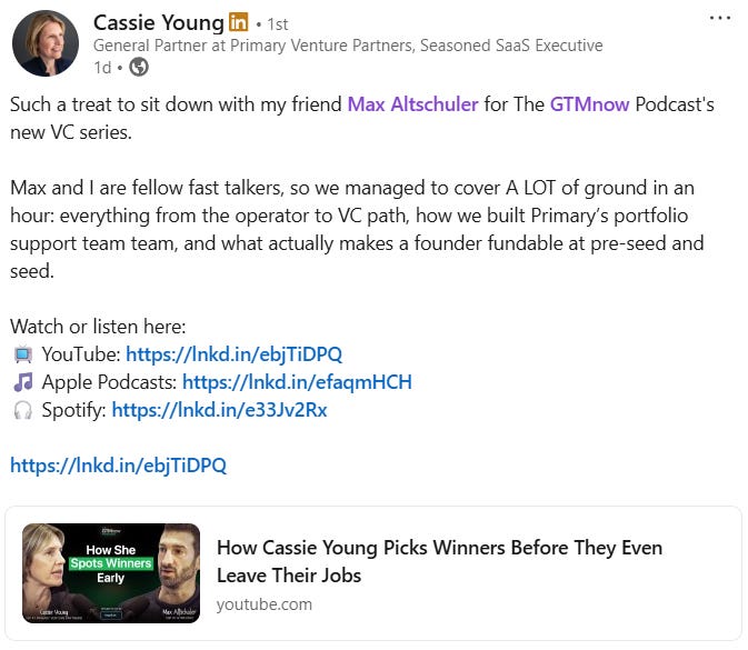 Cassie’s strongest deals come from building relationships with would-be founders while they’re still employed and before any stealth scraper can flag them. That forces her to think like a GTM leader: who is about to have the right earned secret, what catalysts might push them to leave, and what unique value can she offer so her outreach isn’t “just another VC ping.”